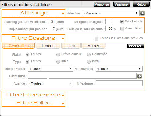 | Nb lignes chargées | Permet de définir le nombre de lignes (par exemple, le nombre de sessions, selon le type de planning choisi) à afficher. |