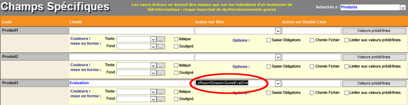 Comme vu dans le point B. les questionnaires sont enregistrés dans des champs spécifiques. Dans ce cas, vous devez activer les champs spécifiques des produits correspondant aux champs spécifiques des sessions. Par exemple : si vous avez activé les champs spécifiques SESSION3 et SESSION4, vous devez activer les champs spécifiques PRODUIT3 et PRODUIT4. :info: Ces champs spécifiques doivent donc être initialement libres.