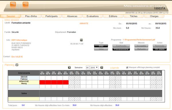 - Mes sessions : accédez au détail de vos sessions de formation, dates, intervenants qui travaillent avec vous, liste des participants, saisie des absences, saisie des habilitations, éditions des documents