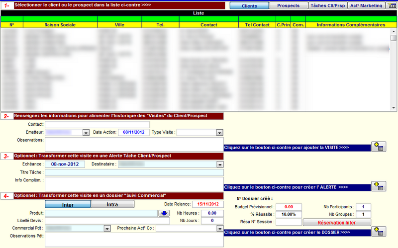 L'assistant de suivi de visite est un écran regroupant l'ensemble des fonctionnalités de prospection commerciale. Il permet :