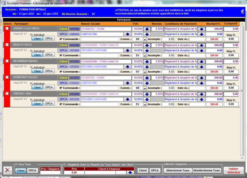 Vous renseignez pour chaque participant le montant à payer par le client et l'OPCA (dans le champ Montant Fi.).