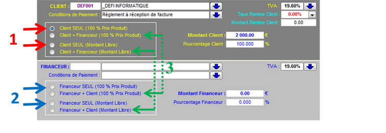 Si vous avez choisi l'option “100 % Prix Produit”, vous devez renseignez le montant ou le pourcentage de l'un ou l'autre des partis dans le champ Montant Client ou Montant Financeur. GesCOF calculera le montant de l'autre parti.