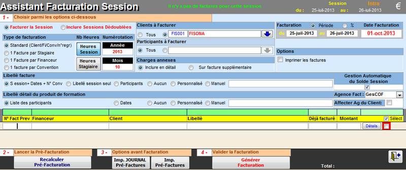 | Inclure Sessions Dédoublées | Génère les factures pour la session en cours et ses sessions dédoublées. |
