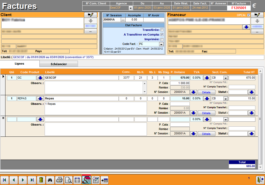 • N° Session : les factures de session sont rattachée à une session. Le bouton permet d'accéder à la session.