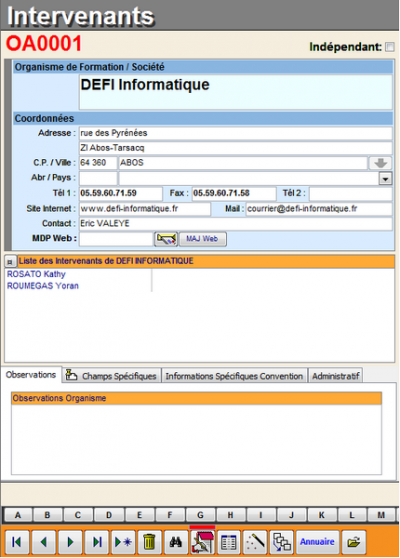 Les intervenants (ou formateurs) sont les personnes physiques qui interviennent.