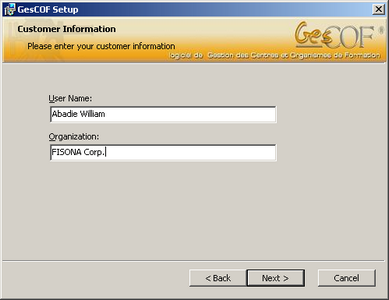 Renseignez le nom de l'utilisateur et de l'organisation (par défaut celui de l'ordinateur). Puis cliquez sur “Next”