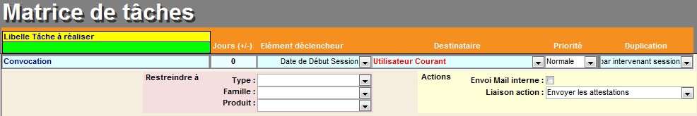 La matrice des tâches est un modèle de tâches destiné à être reproduit sur les sessions. Les tâches peuvent être dupliquées par intervenant, convention, stagiaire ou client.