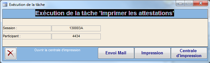 Pour reprendre l'exemple précédent, l'impression des attestations d'un ou plusieurs participants sur la session 130003A solde les tâches “Envoyer les attestations” pour les participants correspondants. L'impression peut être réalisée en exécutant une des tâches ou directement depuis la session en utilisant l'assistant d'envoi de mail, la centrale d'impression ou le menu Documents / Stagiaires.