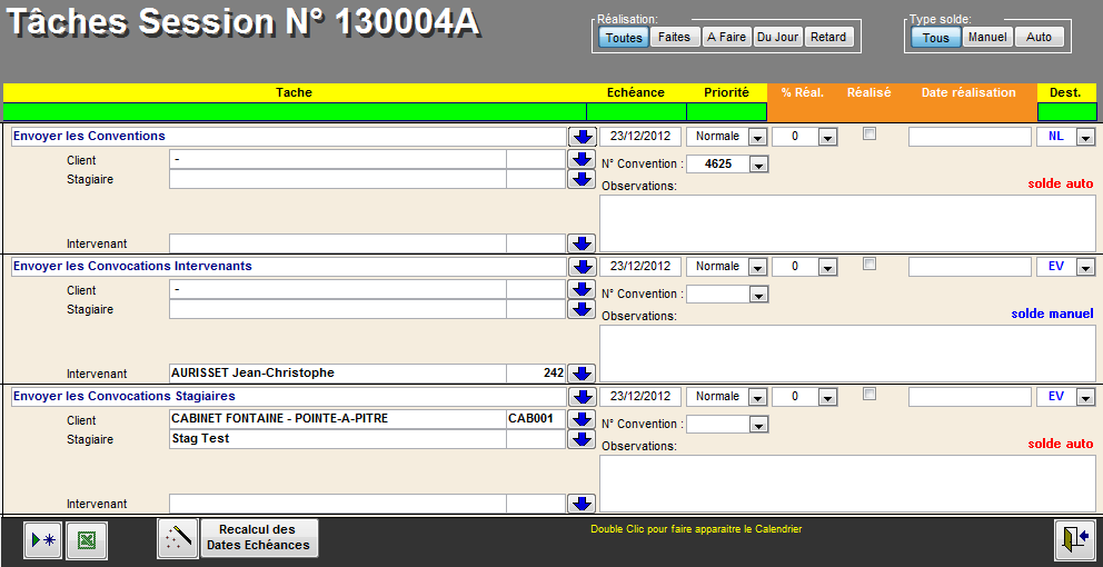 Le bouton permet de générer, pour la session en cours, toutes les tâches des matrices dont le déclencheur est automatique.