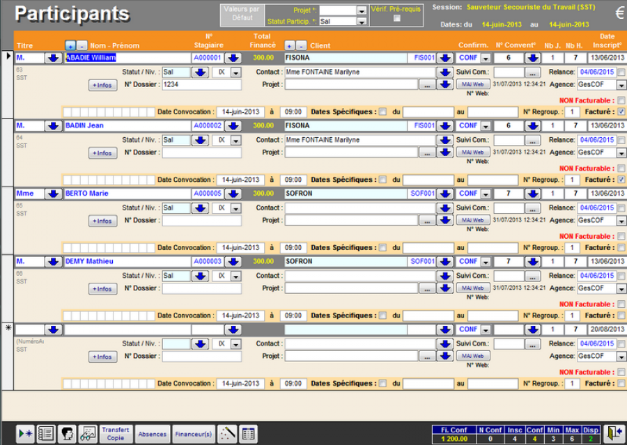 Vous renseignez pour chaque participant le montant à payer par le client et l'OPCA (dans le champ Montant Fi.).