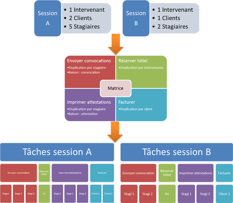 | Duplication | Elément de session (client, convention etc…) auquel la tâche sera liée. Si on ventile cette matrice en automatique, il y aura autant de tâches que de ce type d'élément dans la session |