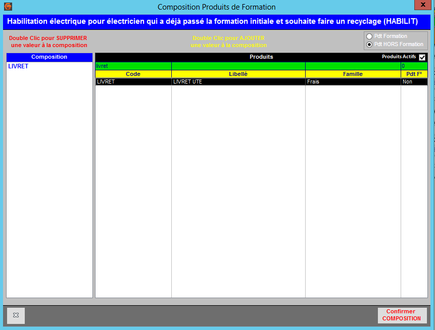 | Tarifs spécifiques produis composés | Uniquement pour CACES et habilitations électriques. Permet de saisir une grille tarifaires des compositions |