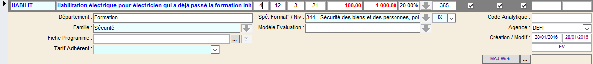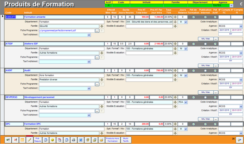 | Pdt Formation | Cette case est automatique décochée à la création d'un produit hors-formation. Elle permet de distinguer les produits de formation et hors formation. |
