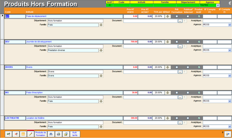 L’écran de Produits Hors Formation vous permettra de saisir des produits que vous pourrez facturer en tant que charges annexes sur une session ou pour faire des Factures Directes, des factures sans organiser de sessions pour facturer des prestations annexes (Conseil, Audit, Location, …)