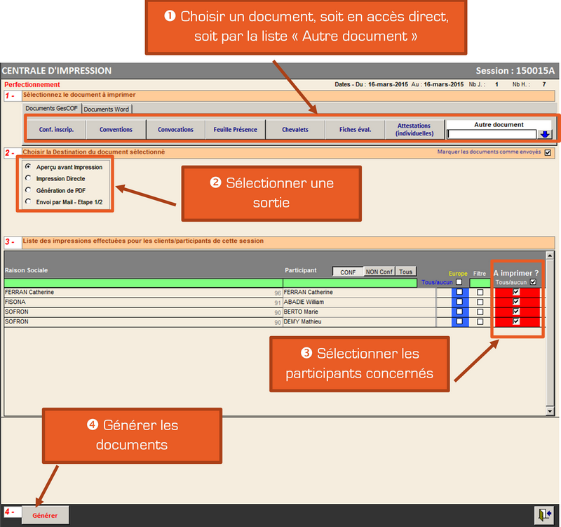 La centrale d'impression permet de générer des documents clients ou stagiaires depuis une session.