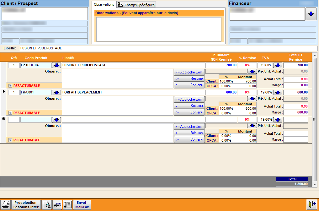 Envoi Mail/fax : permet d'envoyer le devis par email.