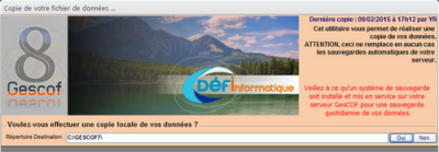 Selon votre version, l'écran de sauvegarde s'affiche. GesCOF sauvegarde votre base de données dans deux destinations :