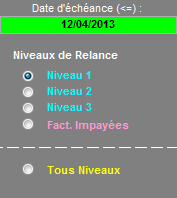- Tous Niveaux : affiche toutes les factures impayées quelque soit le nombre de relances déjà effectuées.