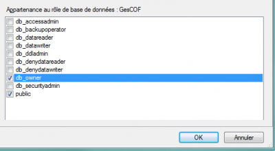 Il faut définir une connexion SQL Server qui sera utilisée par GesCOF. Elle devra permettre de lire, écrire et modifier la structure de la base GesCOF. Nous conseillons aussi d'autoriser la création de backups de la base. Sauf contraintes de sécurité importantes, vous pouvez utiliser le rôle prédéfini db_owner.