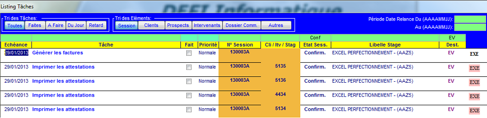 Les tâches sont générées dans les sessions :