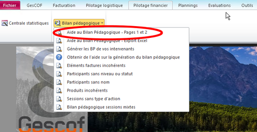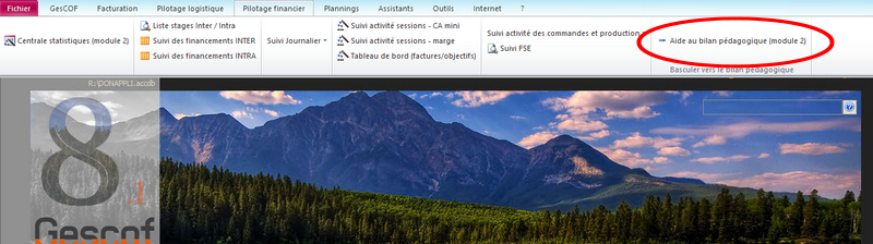 Le module “Bilan pédagogique et financier” se situe dans le module additionnel de GesCOF. Pour le démarrer, ouvrez le menu Pilotage financier puis Aide au bilan pédagogique (module 2)