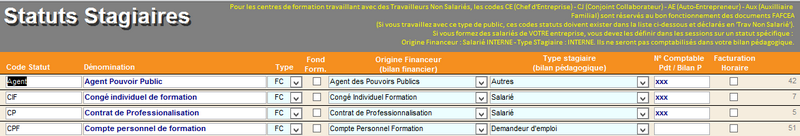 Les statuts sont configurés à partir de l'écran d'accueil (menu GesCOF > Fichiers/Listes > Statuts > Statuts stagiaires). Vous devez les configurer en fonction de votre public et en faisait correspondre les entrées Origine financeur et Type stagiaire en adéquation avec les attentes du bilan pédagogique et financier.