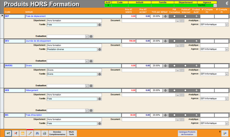 L’écran de Produits Hors Formation vous permettra de saisir des produits que vous pourrez facturer en tant que charges annexes sur une session ou pour faire des Factures Directes, des factures sans organiser de sessions pour facturer des prestations annexes (Conseil, Audit, Location, …)