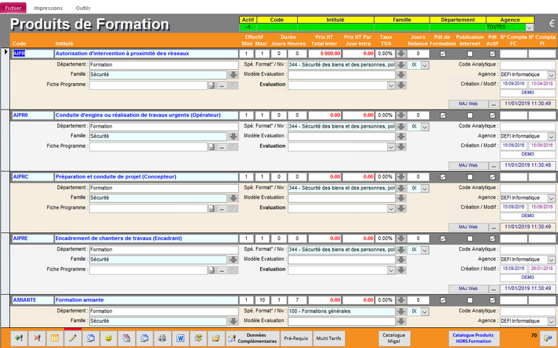 | Pdt Formation | Cette case est automatique décochée à la création d'un produit hors-formation. Elle permet de distinguer les produits de formation et hors formation. |