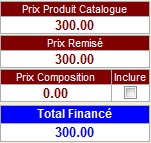 Prix Composition Coût des produits de la composition (dans le cas d'un produit composé). Cliquez sur le case Inclure pour inclure le montant de la composition dans le total financé.