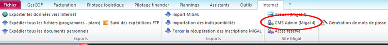 - Depuis l'écran d'accueil de GesCOF, ouvrez le menu Internet et cliquez sur CMS Admin