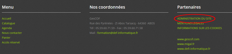 - Depuis votre site internet Migal, cliquez sur le lien en bas de page ADMINISTRATION DU SITE