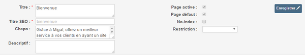 | Titre SEO | Titre de l'url servant au référencement de la page |