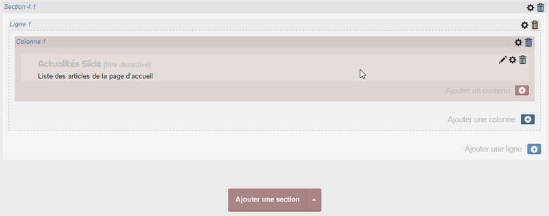 - la section : la section permet de structurer la page soit en une section unique (100%), soit en une section et une sous-section à droite (2/3 | 1/3) ou à gauche (1/3 | 2/3). Ces sous-sections sont des colonnes fixes.