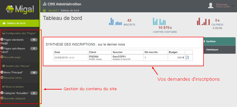 - de consulter l'activité sur le site : statistiques des inscriptions et visualisation des dernières demandes.